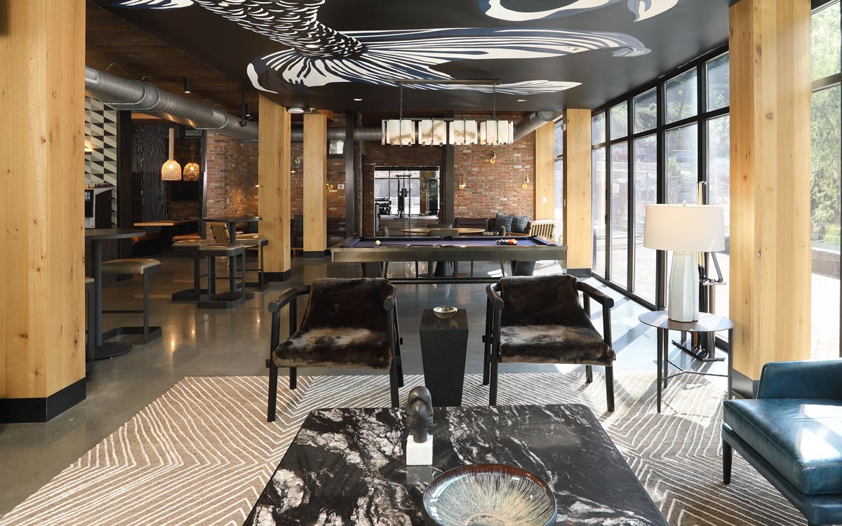 Jamie Stern manufactured Germain by Philippe David area rugs for the public spaces of Rockford Falls Apartments in Wilmington, Delaware. This space was designed by RD Jones.