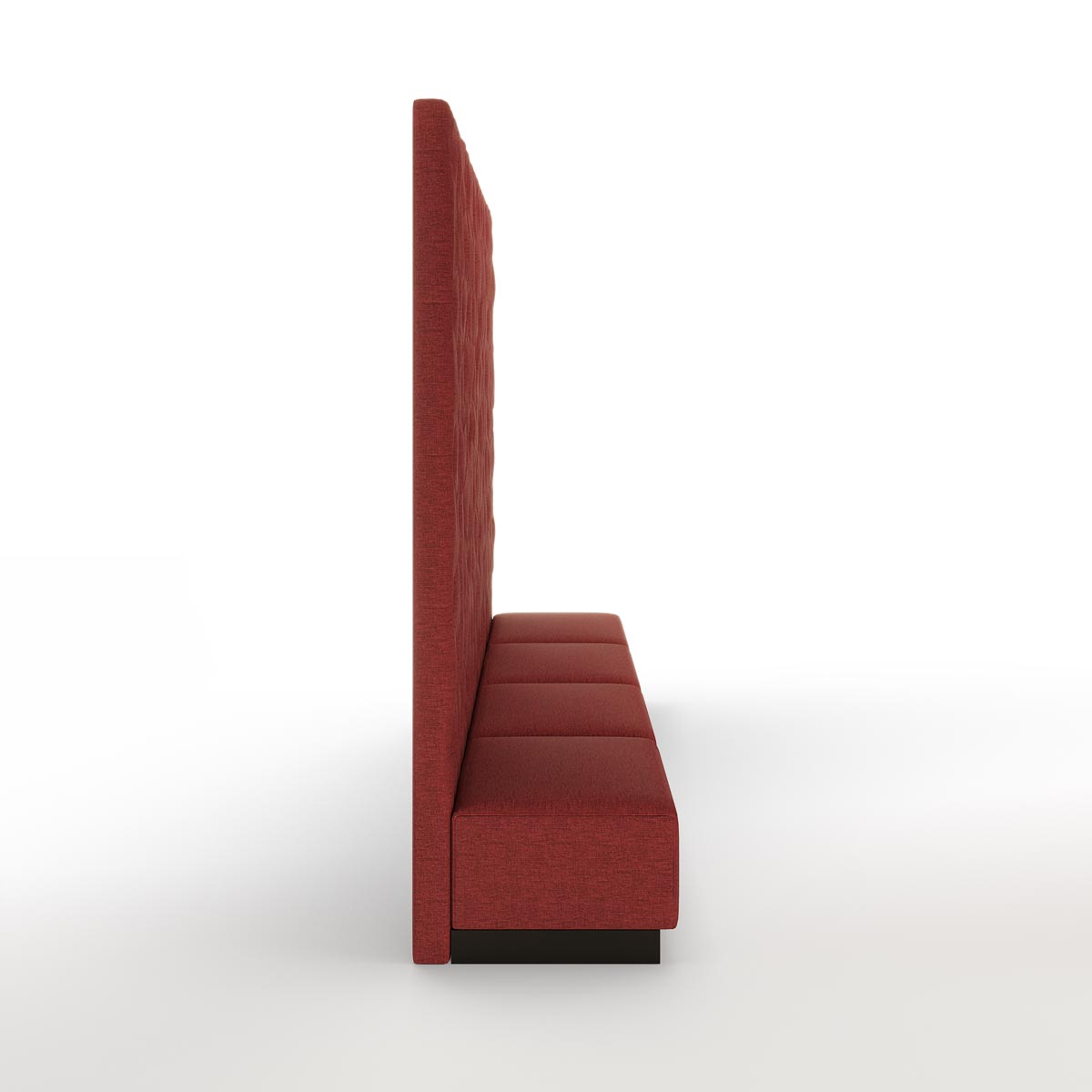 Built in four pieces and ganged together, the Coco isa regal banquette featuring an immense, diamond-tufted inback, a recessed wood plinth base and tons of character.