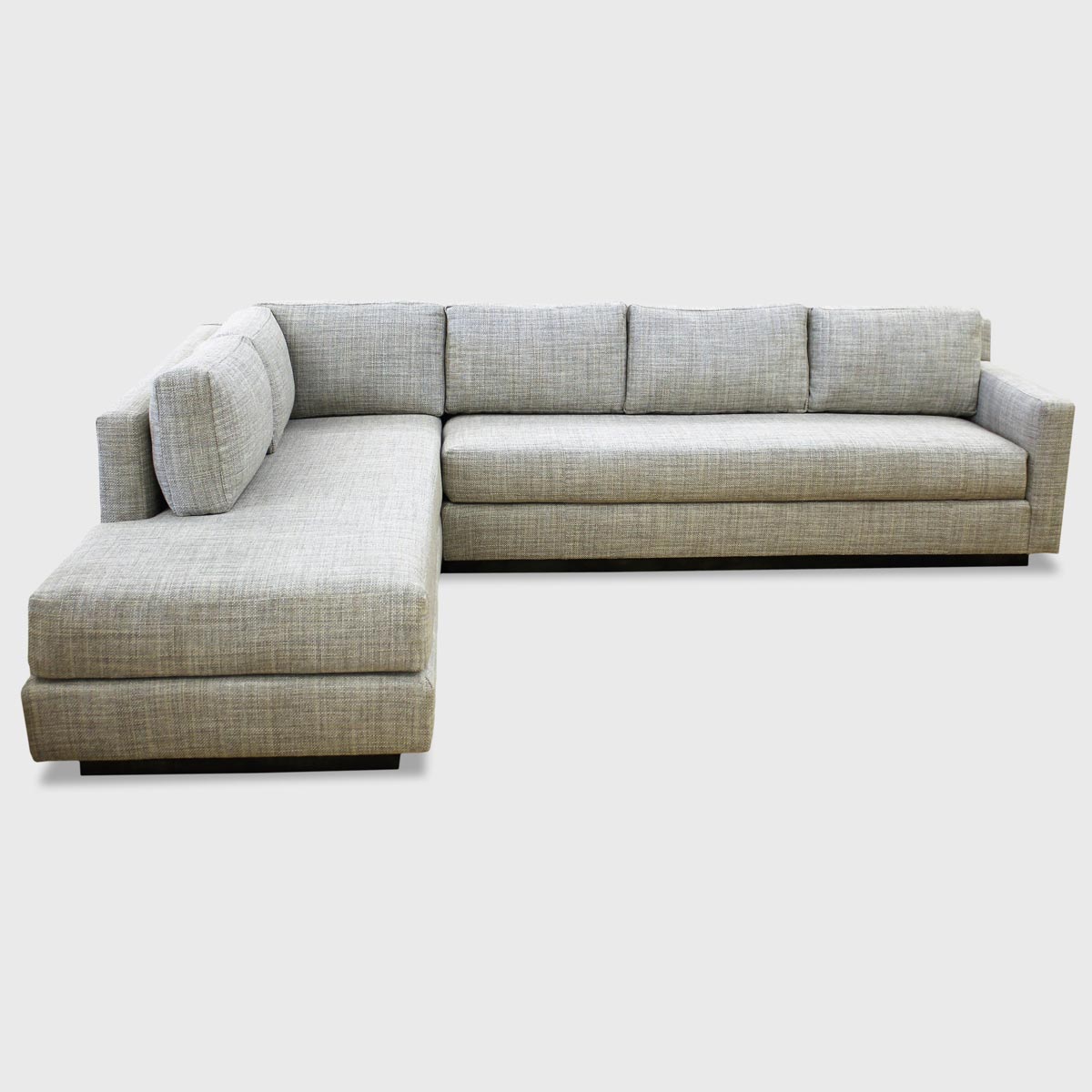 The Franklin Sectional’s angular frame rests on a recessed wood plinth base and features loose back cushions as well as two bench cushions, the results of which are exceedingly comfortable.