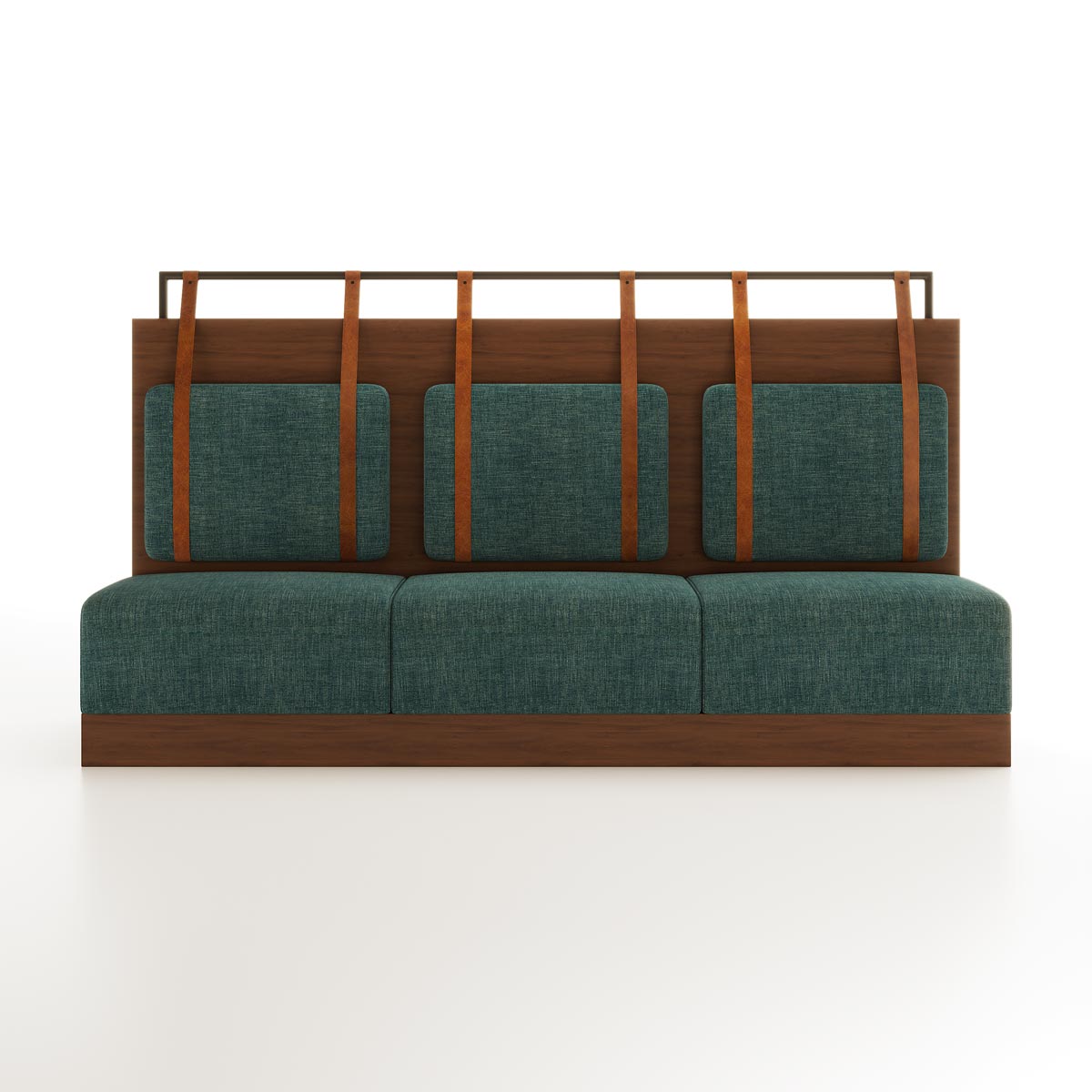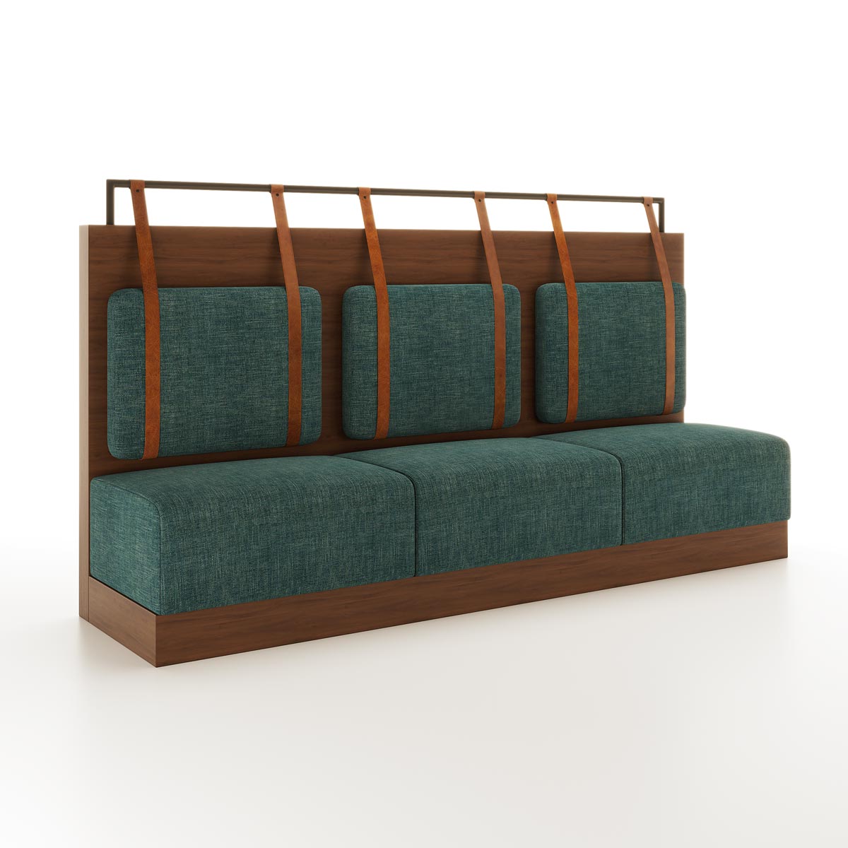 The Frisco is a truly unique banquette, featuring tight divided seat cushions, a solid wood frame and three separate loose back cushions held by vegetable-tanned leather straps on a metal rod.