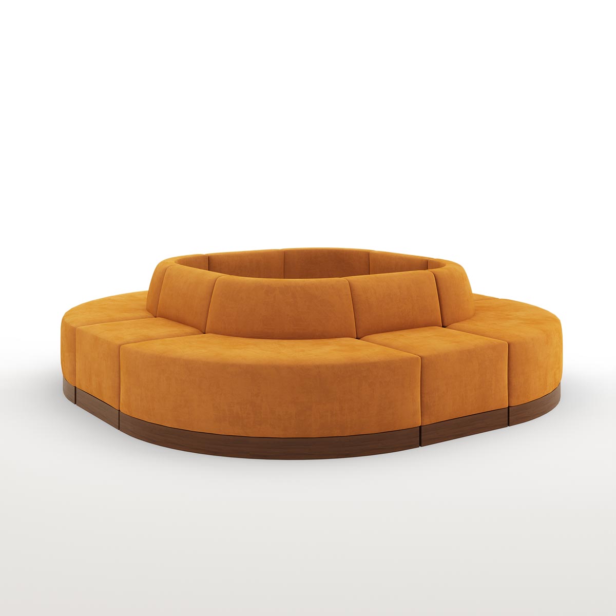 The Piccadilly is a round banquette built in eight pieces and ganged together. It features a tight back/tight seat construction as well as cutouts for electrical, in the recessed wood plinth base.
