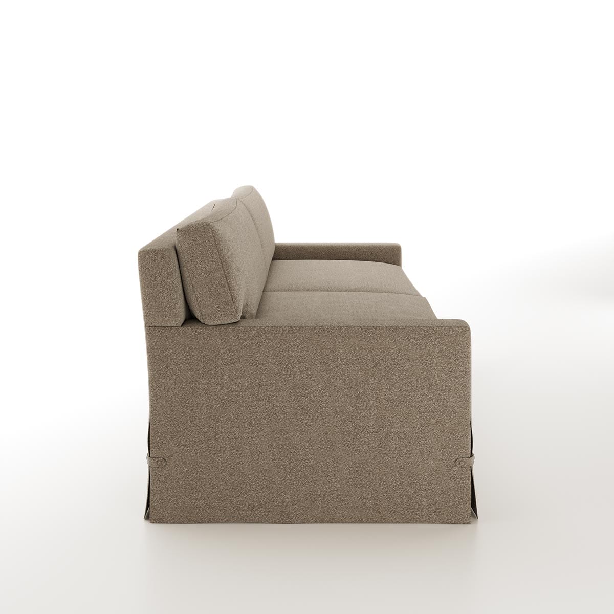 The Russie Sofa is a contemporary square arm sofa with waterfall skirt, placket detail, and down-filled cushion.